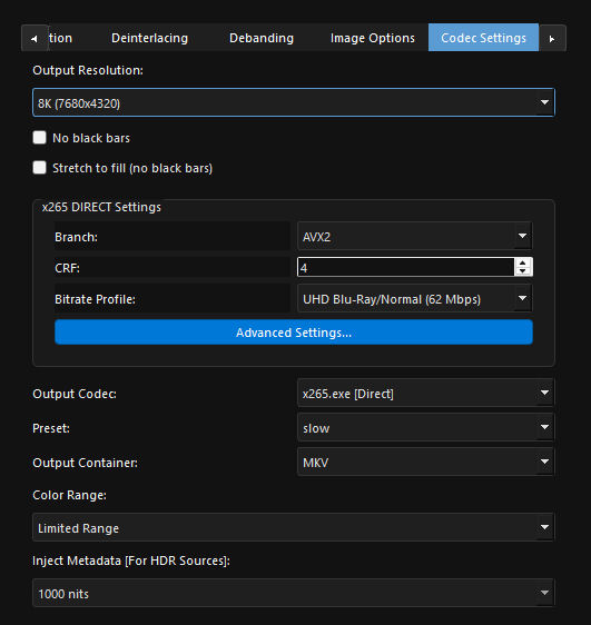 - x265 Direct [CPU Codec] Recommended: Properly includes the dynamic generated HDR SEI/Metadata (HDR10 Compatible flag) from your HDR Mastering Look selected or custom sliders and produces the highest quality HDR mapping.